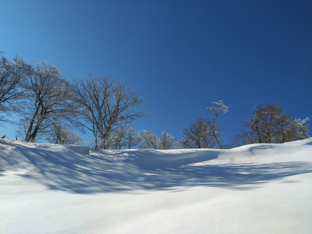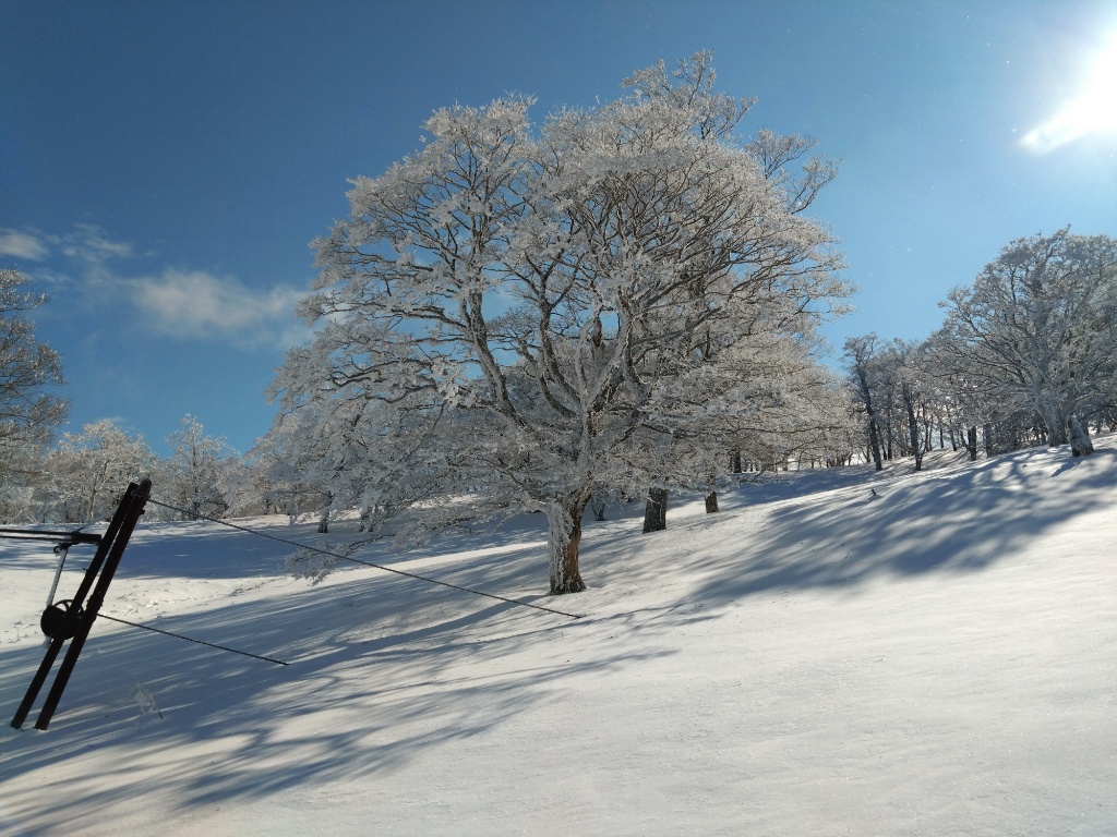 霧氷で覆われた森も素敵ですが、まっ白な雪原と霧氷で飾られた木々の風景は、なんてうつくしいのだろう、と思いました。