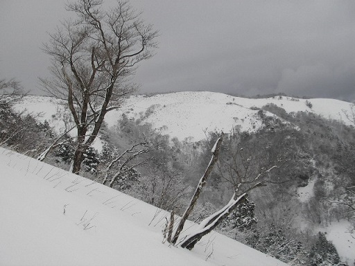 金山尾根分岐から回り込むようにしてホタガ谷源頭コルに滑り込むが、安全第一で滑降なんてものじゃない。今回のツアーで一番気持ちのいいところなのにガーッと滑り込む脚力がないのが残念。