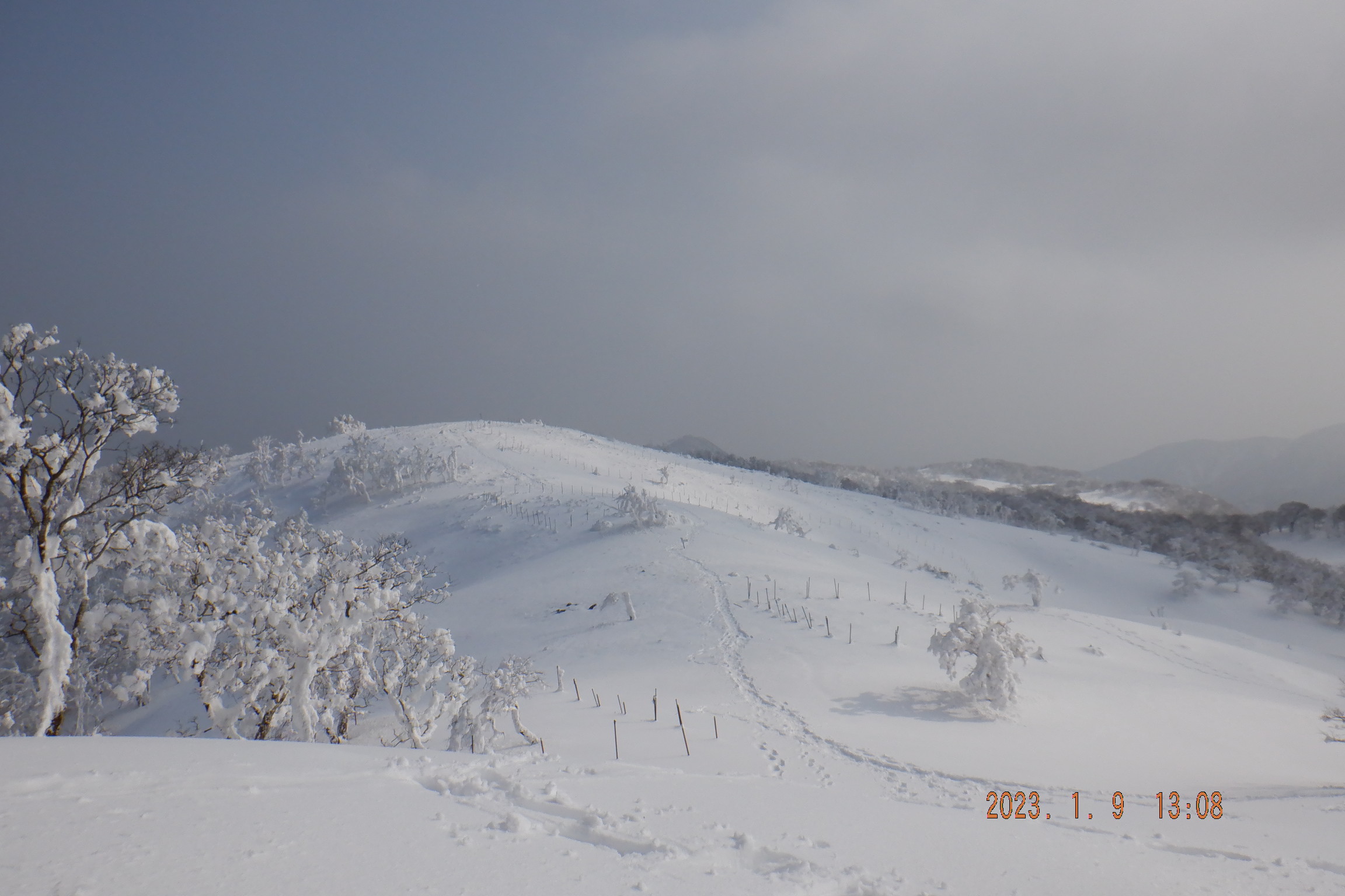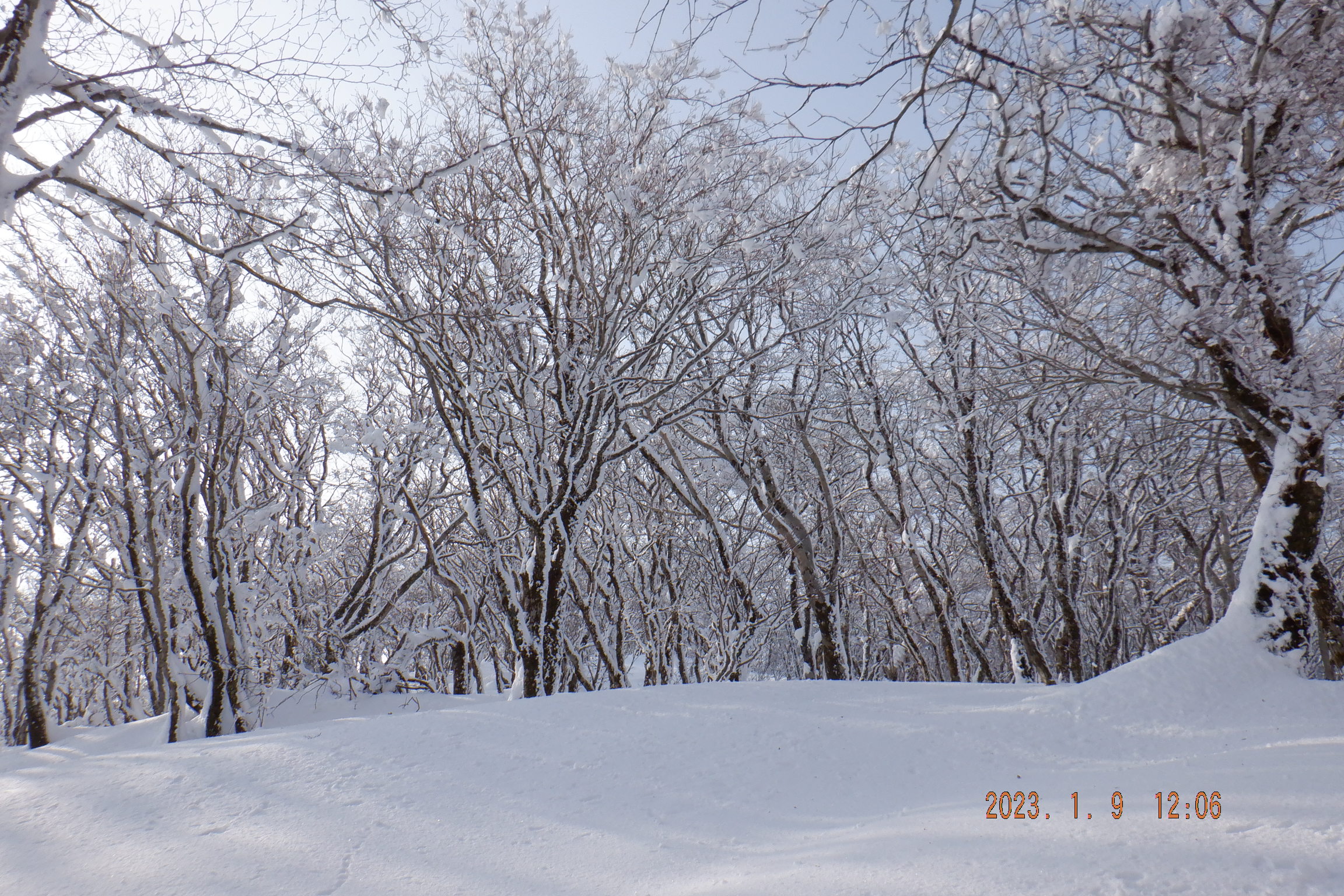 今回はここからが意外にきつかった。綺麗な霧氷が見えていたらもっと高揚して辛さも忘れて登って行くのだが、今回は登り始めから雪も深くなってきて締まっていないので登りにくい。とうとう足の中に雪が入って来たようで冷たいので適当に腰を下ろして靴を脱いだ。