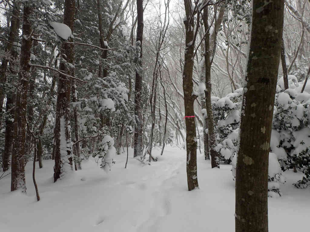 風がないので,霧氷は発達していない。その分,馬酔木などの常緑樹の上に雪が厚く積もって行く手を遮っている。立ち止まると無音という以上の深い静寂に包まれていることがわかる。新雪が音を吸収してしまっているのだろう。