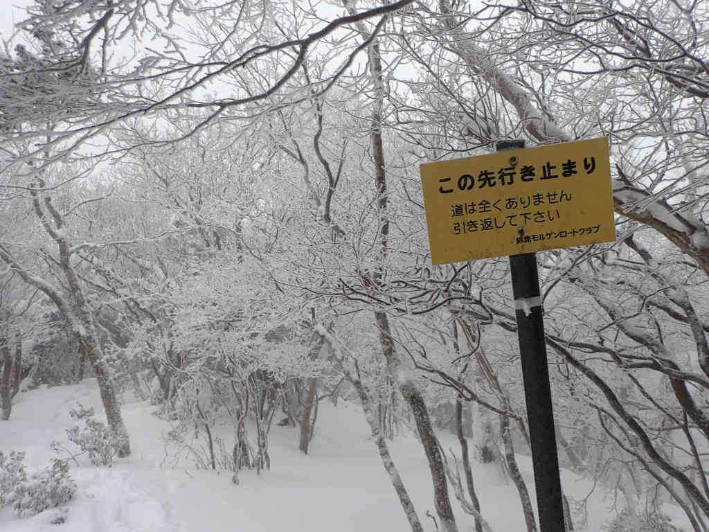 標高800mを越えると,「この先行き止まり 道は全くありません。引き返してください。 鈴鹿モルゲンロートクラブ」と書かれた看板が,下山者に見えるように立っている。おそらく間違ってこの尾根を下る事故が多発したのだろう。このまま下ると熊野集落に行き着くので,死亡事故につながることはないようにも思うが。