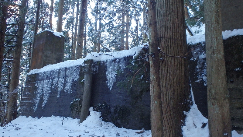 尾根と言っても例にもれず始めは急斜面だ。残雪の表面は中途半端に固く、時折ズボっと嵌り込む。堰堤のようなコンクリート製の建造物が現れた。鉱山施設の遺物だろうか? ほんの標高差40mほどなのに20分もかかっている。