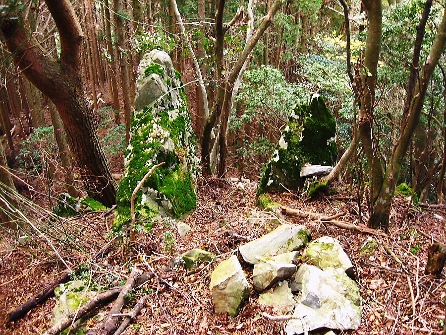 この舟石は女性だよ、脇の立石が男性か。これ黒滝集落の山神さんなんだ。