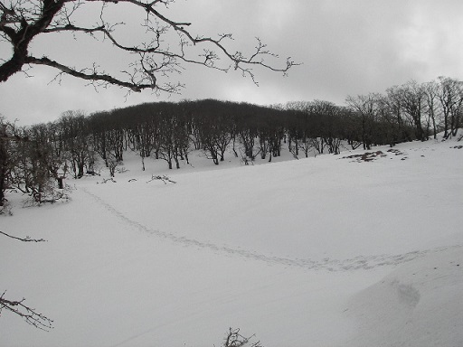7合目で一休みしていると朝明クラブさんたちは夏道をまっすぐ進んでいきました。私は県境稜線を斜めに乗り越していくので右の斜面を登っていきました。