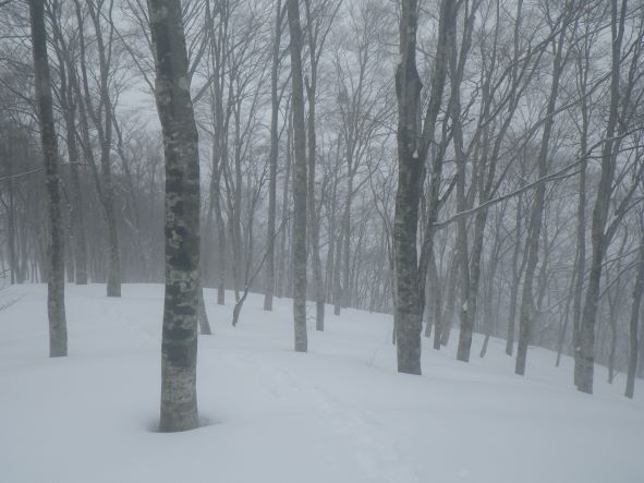 この先、P981.5辺りで西側に針葉樹林が現れるほかは、おおむねブナの林が続く。