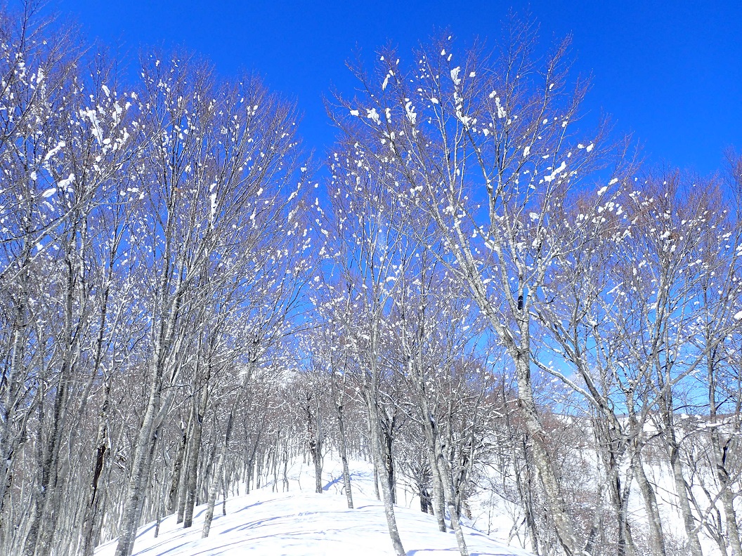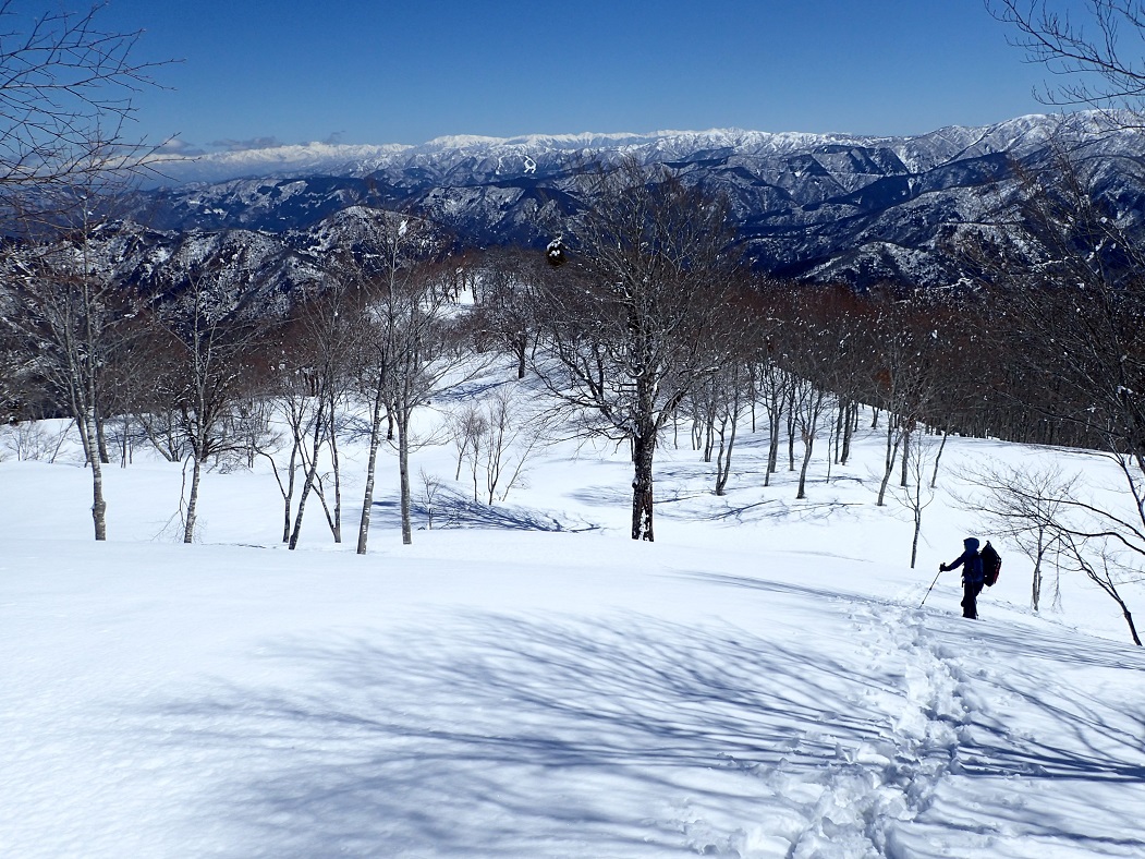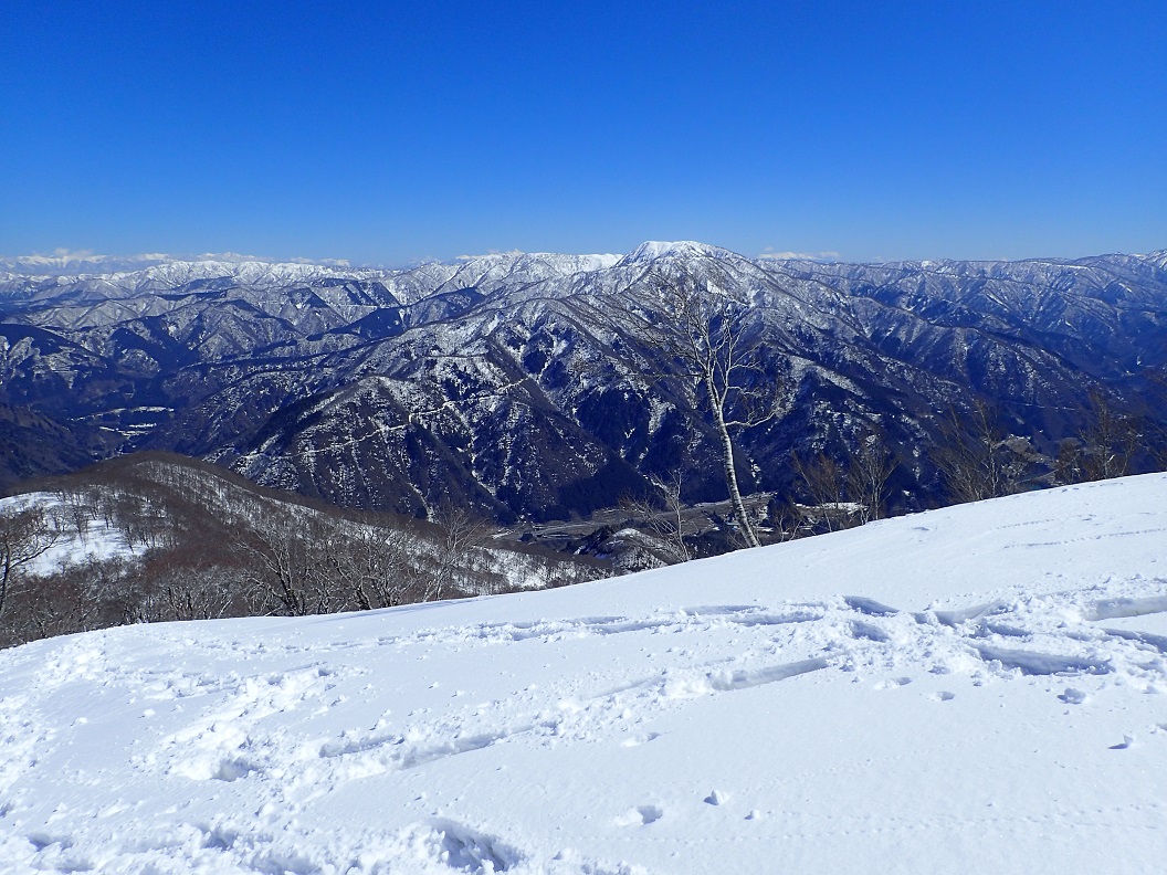2つの鉄塔を過ぎて1221mのポイント。ここらからは、別天地である。素晴らしい天気で、ブナの樹間から南北の山並み、後ろには北アルプスまで垣間見えるが、そのうちに遮るものはなくなり、絶景である。空は「青い」を通り越して黒いぐらいである。春にこんなに空気が澄んでいる日は珍しい。しかも、ほぼ無風である。