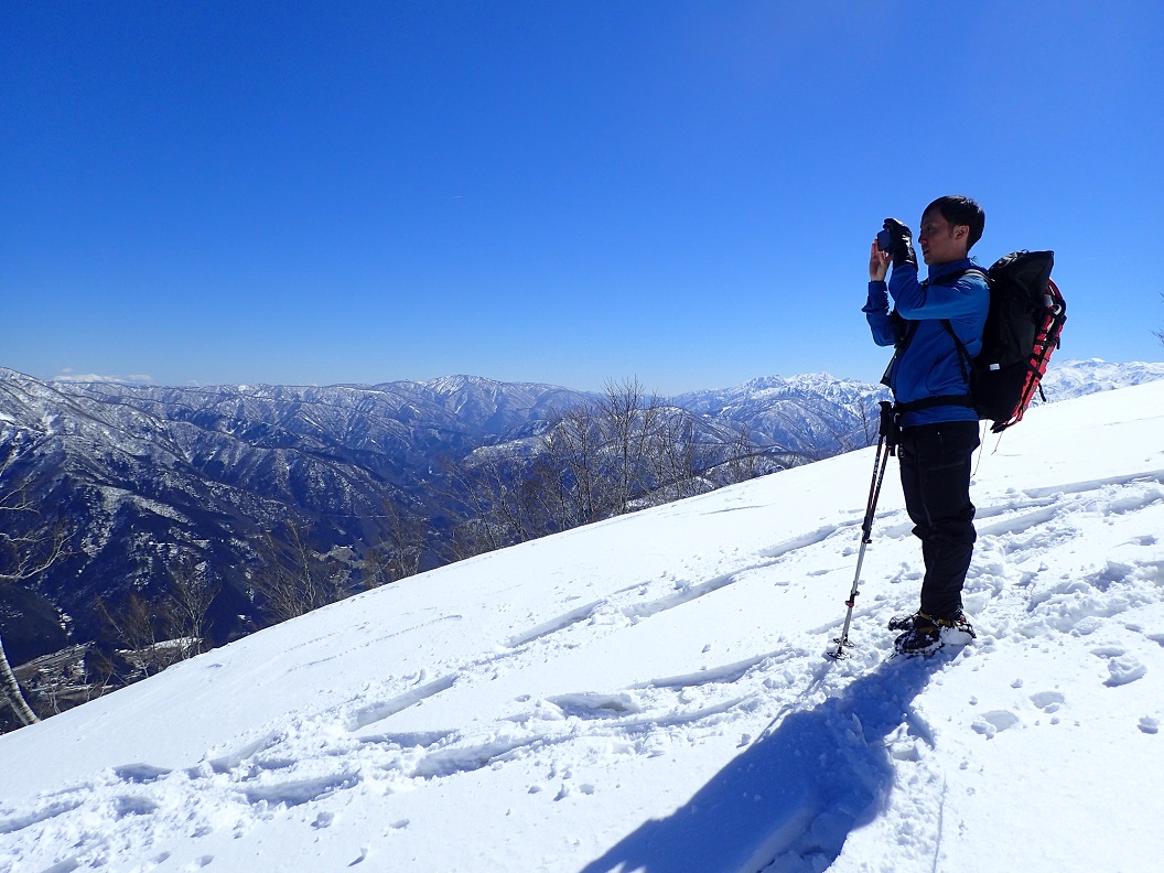すると、東から2人組のスノーシューの登山者が来た。聞くと、大門山から来たという。彼らは、我々を見て、足跡がないところを歩いてきたのに、頂上に人がいるので驚いたと言っていた。すごいロングルートを歩いてきたようだが、一体どこから入山したのか。