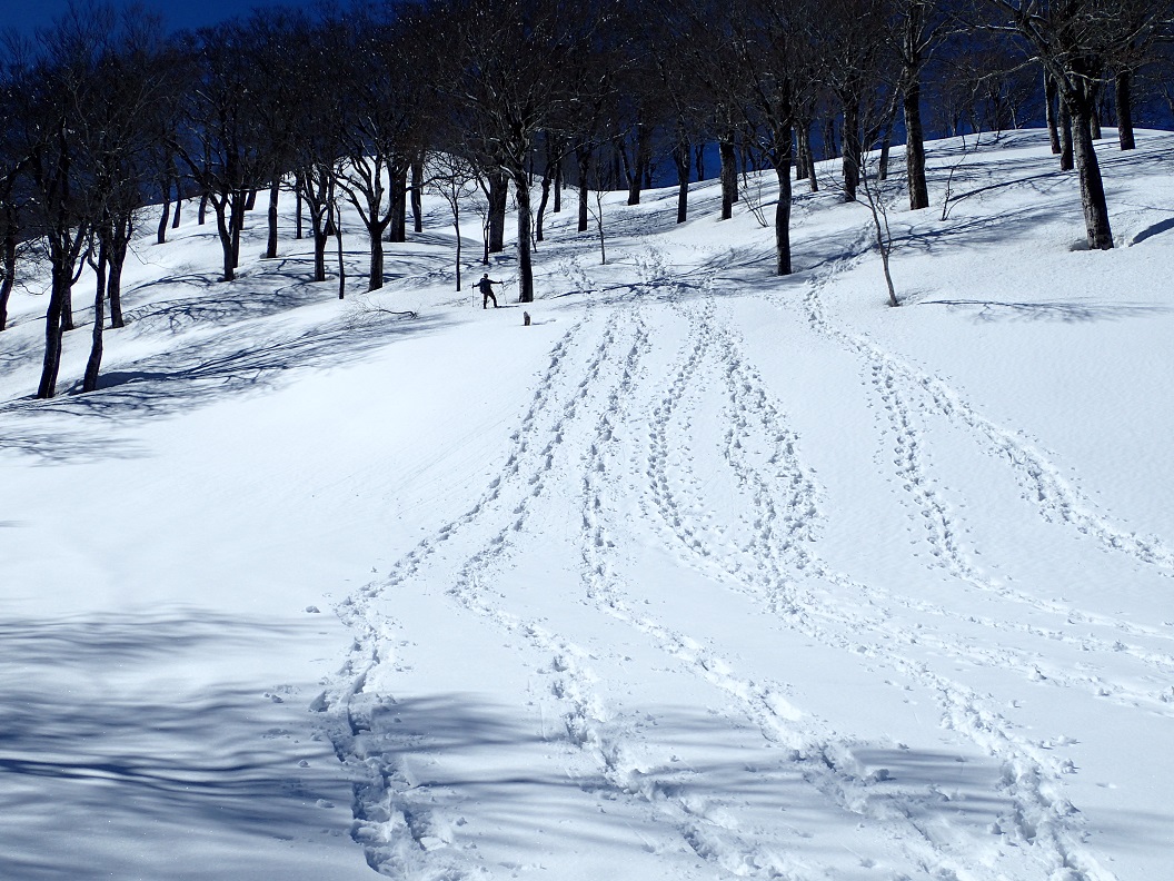 下山は往路を引き返す。しかし、最後の林道はほぼショートカットせず、素直に歩いた。雪山の下山はあっけない。下の方の急な斜面はシリセードを活用した。