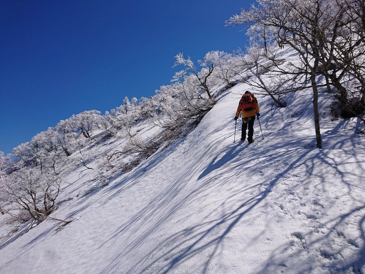 見上げると尾根上の木々の枝には、融けかかった霧氷のしずくが陽の光を浴びてキラキラと輝いていた。