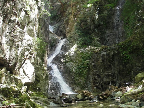 ゴーロを進んでいくといきなりゴルジュと25m三段滝が現れた。