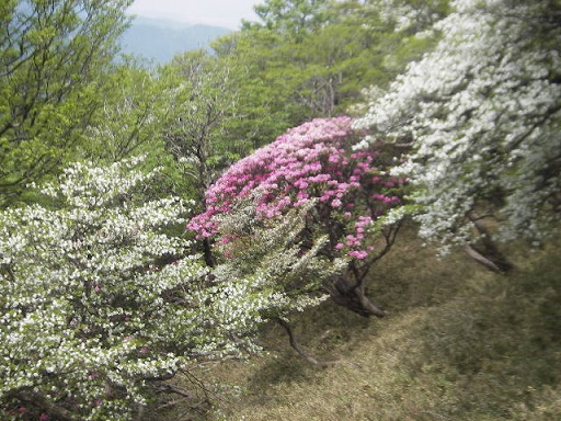 遅めのランチを済ませて登山道で下山した。山頂付近はシロヤシオとシャクナゲが咲き乱れていた。