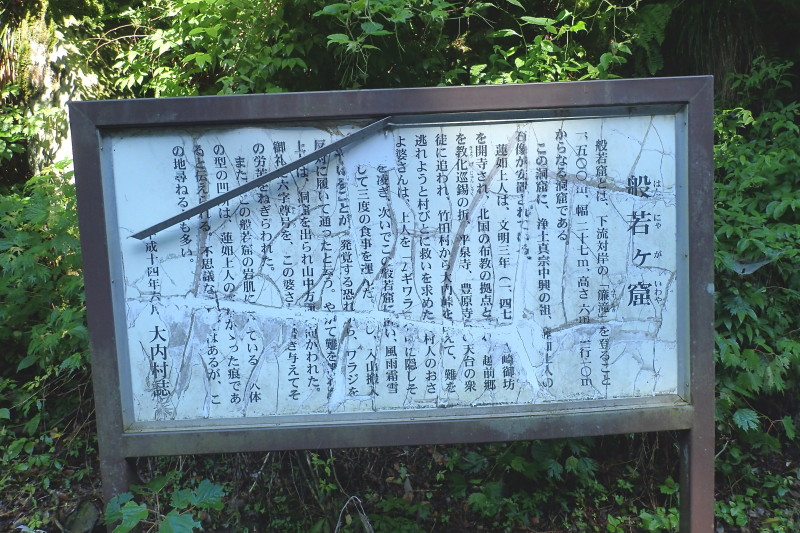 大内村の人びとが、豊原寺の天台宗徒に追われた蓮如を、この足のすくむような崖にある般若ケ窟に匿い、おさよさんというお婆さんが、長く険しい道を歩き、一日に三度食事を届けたという言い伝え。大内村の人びとの信仰心の厚さを、きりきりと感じました。