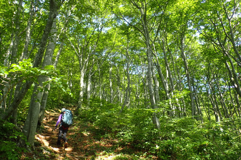我谷ダムからの登山道に飛び出した。あたりは一面のブナ林だ。富士写ヶ岳のメインルートだけあって幅広