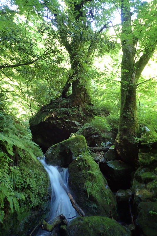 初っ端から、五感を楽しませてくれる谷でした。しっとり苔むした岩、躍動感ある流れ、緑滴る森、岩を飾るいろいろな形をした葉っぱ・・・すべてが生き生きとしてうつくしく、よろこんでいるうちに二俣に着きました。