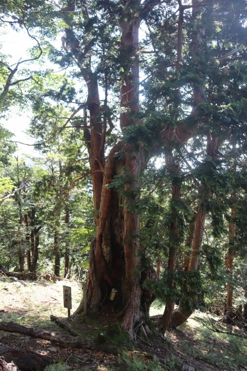 地図とコンパスを見ながら適当に下ると、踏み跡っぽいものがあった。そこを辿ると下に大きな桧があった。そばまで行くと「千秋社 御神木」の立て札が立っていた。やった!まずは御神木が見つかった。ありがたい。