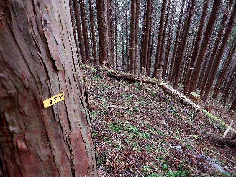 テープを巻いてナンバーを打ってある木には材にできそうな太いのが有る。