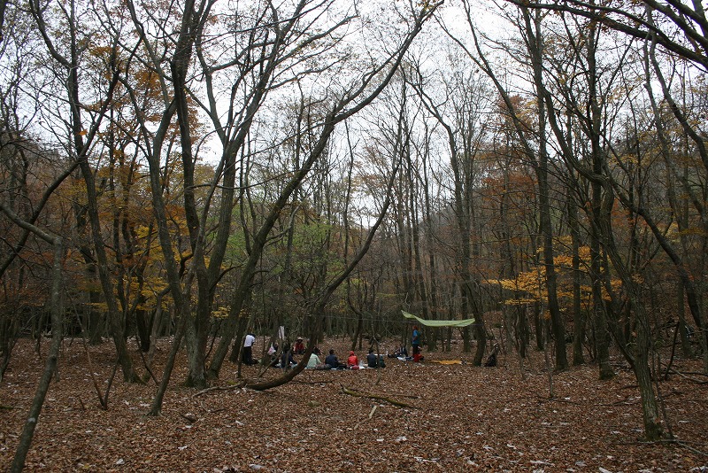 県境縦走路が直角に曲がるところのその先少し降りたところにタープが張ってある。みなさん集まっていた。30分の遅刻。幸い、主催者もちょうど来られたところで、これから始まるところだった。