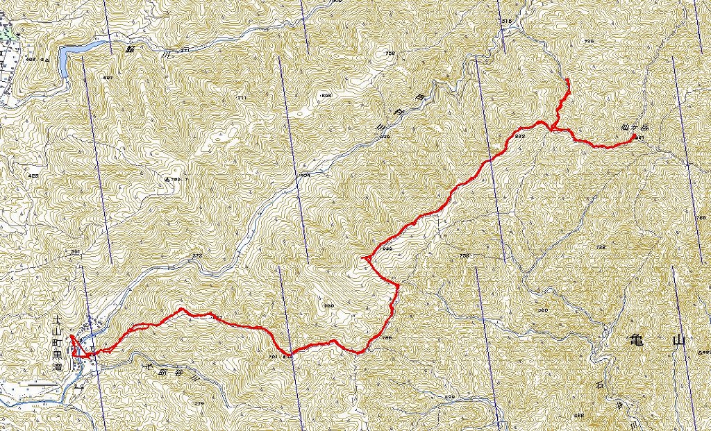 【ルート】黒滝公民館7:30---田村川林道---8:15橋、田村川起点---8:40割谷出合---割谷左岸尾根---10:00県境縦走路分岐---10:05御所谷分岐---10:35仙ヶ岳10:45---11:15御所谷分岐---12:00グミの木平13:00---13:10小太郎谷出合---13:25舟石---13:45ベンケイ---14:15ベンケイブナ---14:55惣王神社---15:00黒滝公民館