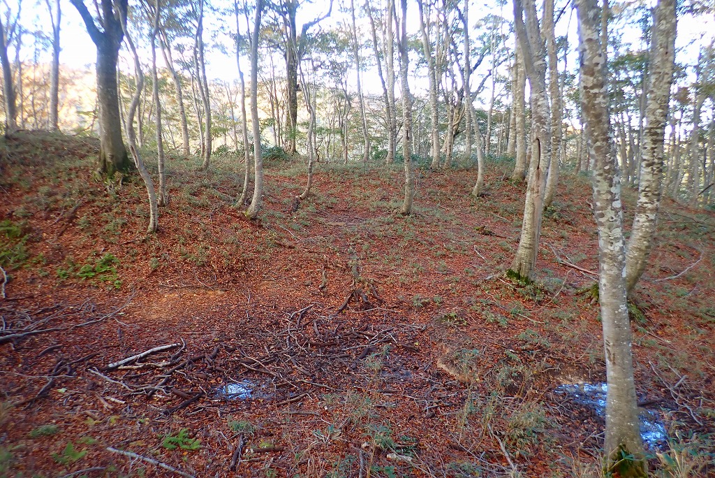 雨が多い時期なら池ができると思われる水溜まりや、長く延びた二重山稜もあり、豊潤なブナの森を歩く歓びに別