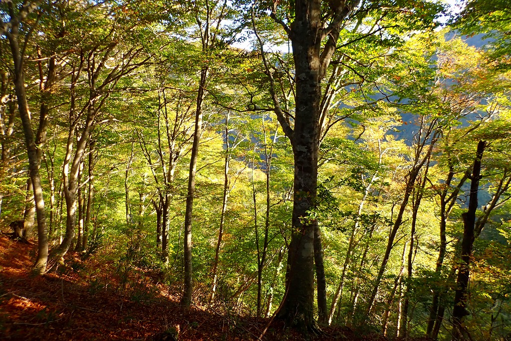 東向きの尾根なので、行きも帰りも進行方向に日が当たって、ブナの森を美しさを際立たせている。