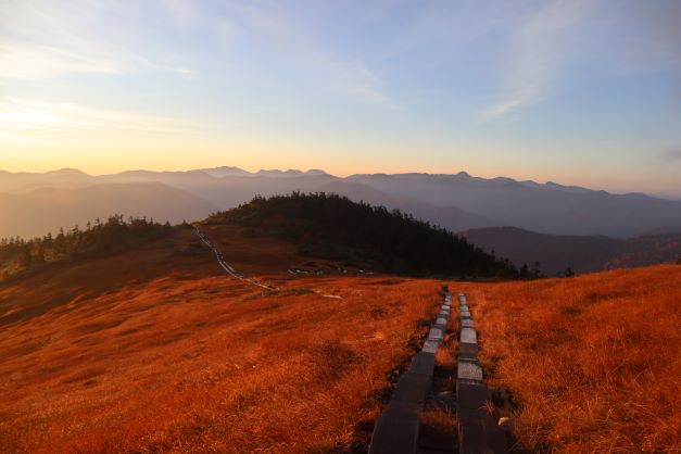 急いで身支度をして登山靴を履いて外に出る。木道には霜が降りている。滑らないように気を付ける。