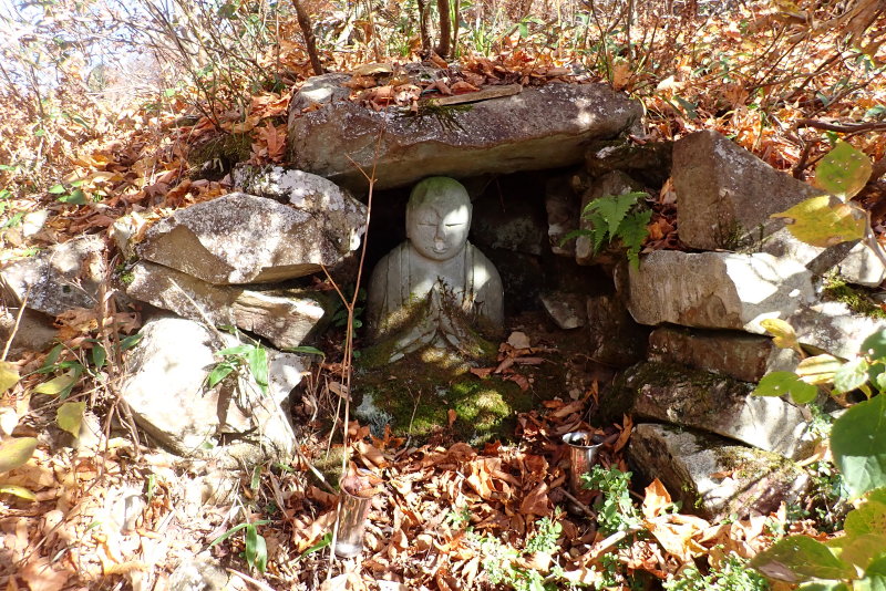 石垣の中に祀られた、おおきなお姿でやさしいお顔をした鼻の下が欠けたお地蔵さま。峠の標高は約960m。初めてお会いした時、この峠道を行き来した人々の切なる思いのようなものを感じて胸が熱くなりました。