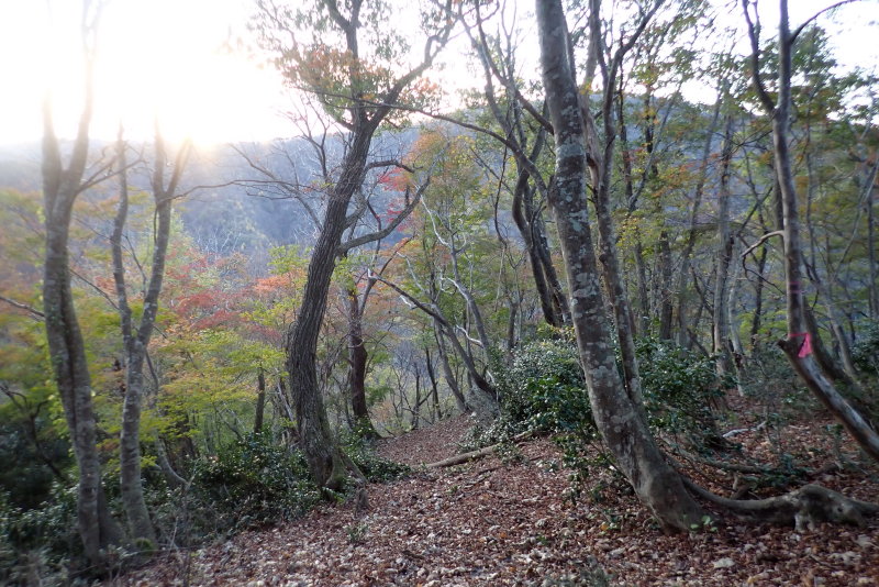 小原へと下る尾根はカエデも多く、赤や黄に彩られた木々が、午後4時前の黄味を帯びたやわらかな陽射しを受け、