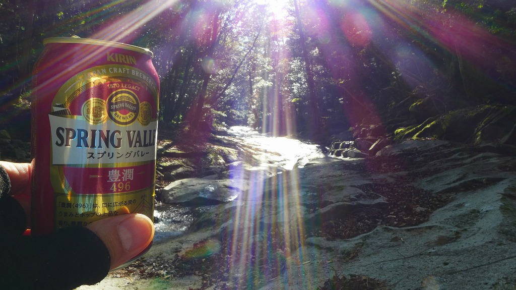ここで、12時30分 陽が射している二の俣へ歩を進めて陽だまりでゆったりビアーランチとした。