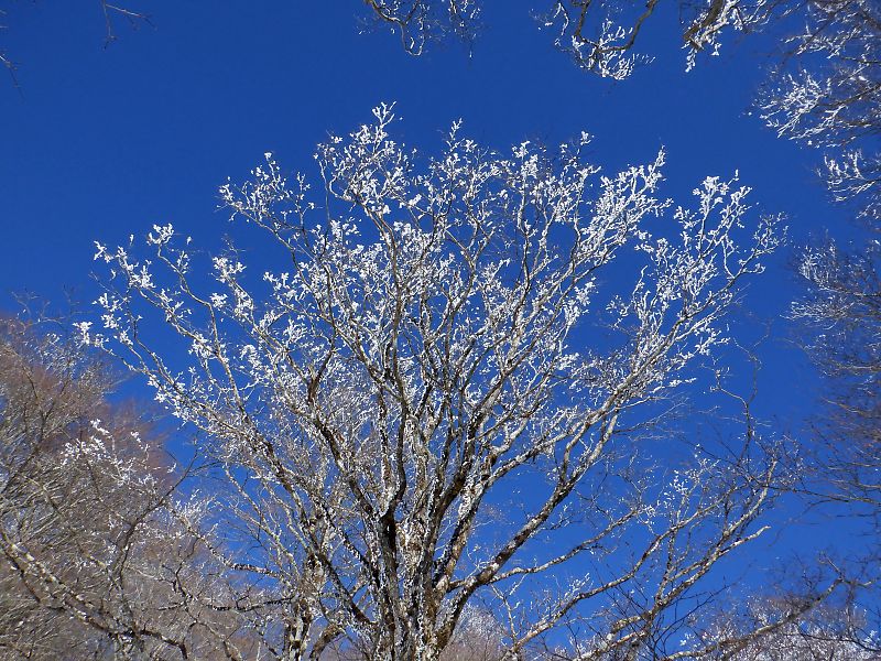 桧塚南斜面を登る。稜線に出ると霧氷の落ち残りが。