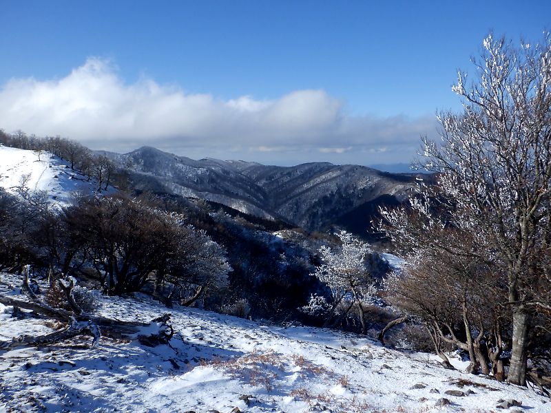 前の週に霧氷の付いていない木梶吊り尾根で寒風にさらされて泣いていました。