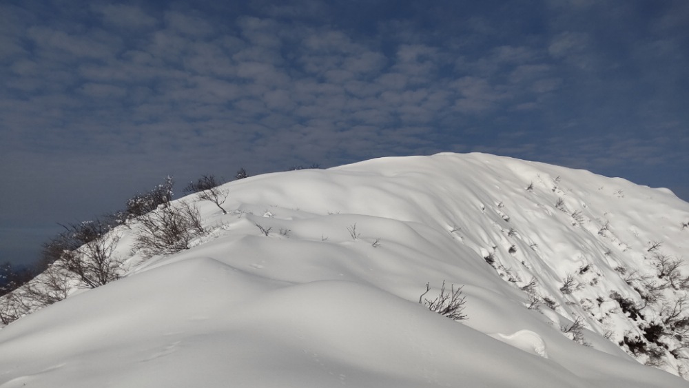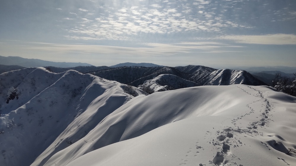 尾根に出ると、一面の雪で覆われた雑木林の中に、なんとなく道型らしきラインを感じた。