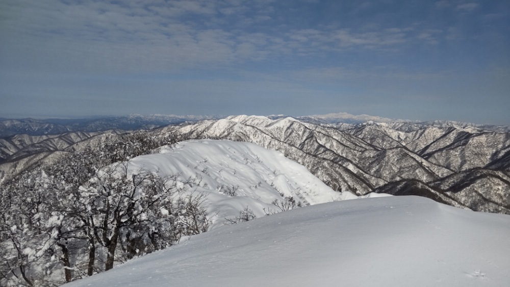 上から眺めた通り、ブナの林が続く素敵な尾根だった。雪は重いが、足にやさしい傾斜なので歩みも順調。