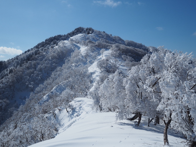 この北稜が魅力的の一つはブナの叢林から離れてところどころに点在するブナの孤樹の佇まいだ。尾根上の樹々には雨氷の表面にさらに霧氷がびっしりと発達しているようだ。美しい樹影に出遭うたびに歩みを止めることになるので、なかなか先に進めなくなる。高度が上がるにつれ樹々の表面を覆う樹氷は普段よく見るような霧氷へと変化した。