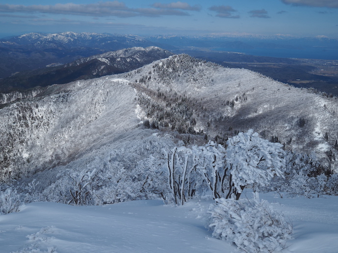 琵琶湖の対岸には冠雪した伊吹山、金糞岳が見えるが、横山岳のあたりに視線を移すと、横山岳の山の姿がよくわからず、代わりにその彼方に白く大きな山が見えているのだった。白山だ。白山から手前には重畳と連なる山々が見えている。少し手前で左手に見える白くなだらかな山は上谷山だろう、対照的に右手に見える三角錐状の鋭鋒は蕎麦粒山に思われる。