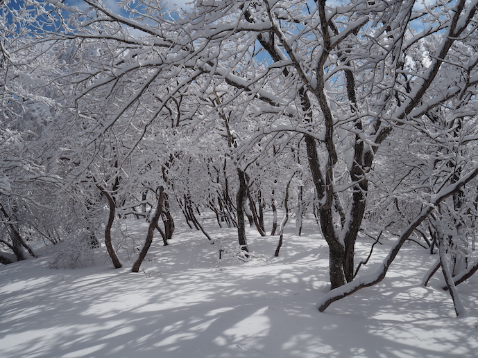 釣瓶岳の山頂からはすぐにナガオの尾根に入る。広々としてなだらかな尾根はまるで霧氷の迷宮のようだ。霧氷の樹々の間からこぼれ落ちる陽光が雪の上に明瞭なコントラストを描いている。先に進むにつれ樹々の間から正面に武奈ヶ岳の姿が大きくなってゆく。ナガオの尾根が南東に向かって大きく曲がるところで、尾根を直進し、広谷に向かって下降する。