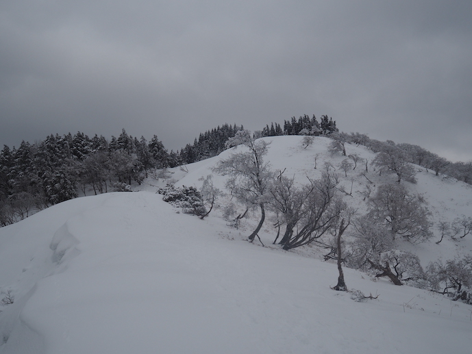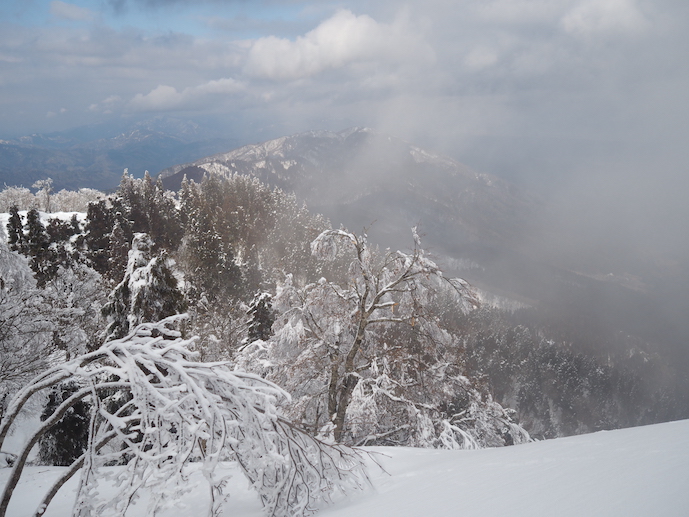 前日には綺麗に見えていた白山はおろか、琵琶湖の対岸の山々すら霞んでおり、対岸の景色は雲に混ざり合っているようだ。尾根は上部に達すると急に周囲の樹々には霧氷が現れる。