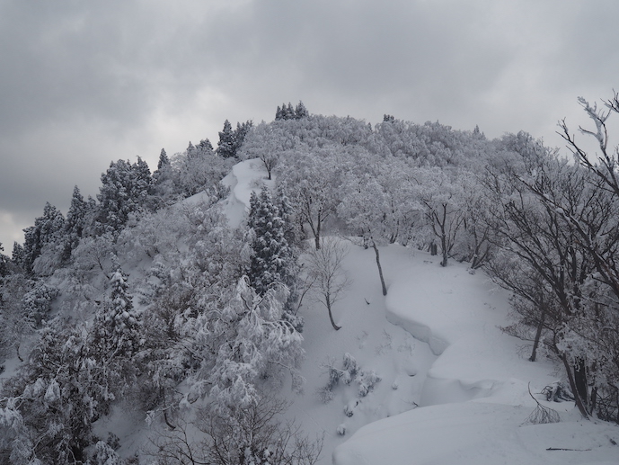 背後を振り返ると蛇谷ヶ峰は急速に雲に覆い隠されていく。釣瓶岳の山頂は十分に霧氷が残っていた。いや、もしかすると昨日から今朝にかけて新たについたものなのかもしれない。