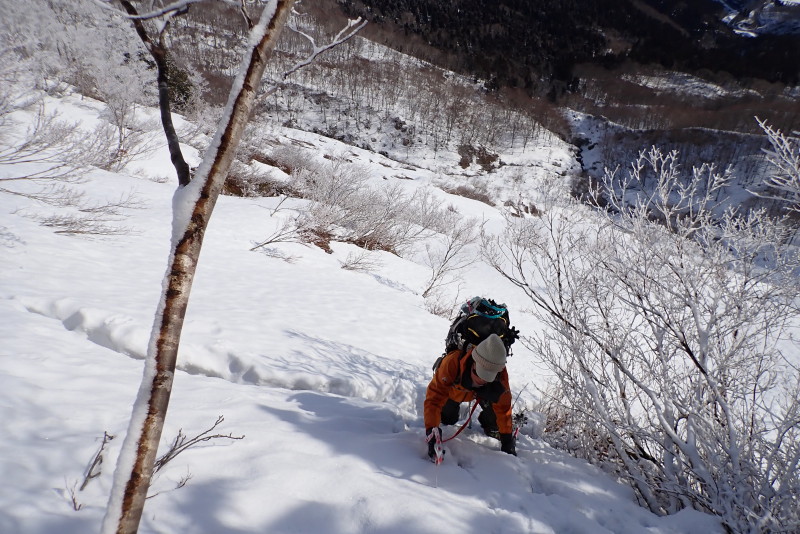 ここから蛇鏡岳への尾根が今日の核心部と言える。雪が付いていれば雪壁状だし、なければヤブを漕がなければ