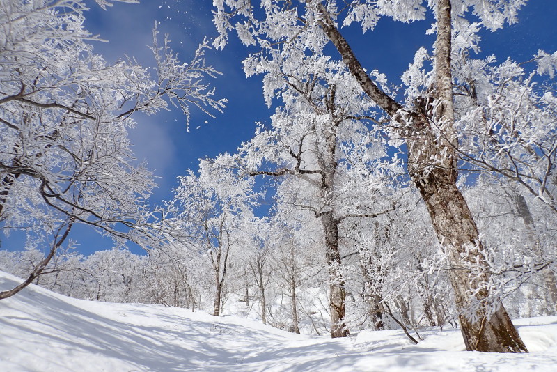 霧氷と新雪にこころが奪われていました。でも、見事な霧氷は直撃されると怖いですね。肩に大きな塊が落ちてきて痛かったです。