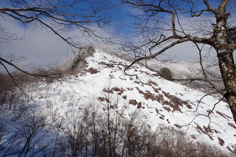 蛇鏡岳への取付きを間違えて隣の尾根を上がりかけてしまった。ここは9年前のスノー衆で使った尾根である。