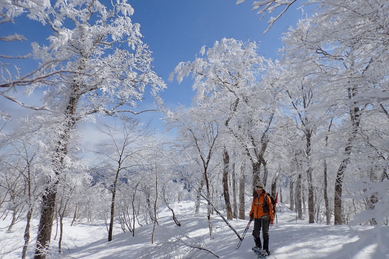 下りはツボ足で。楽しみにしていた、・1153から下ったゆるやかに広がる地形も、素晴らしかったです。ガラス細工のような霧氷も残っていてうれしかったです。