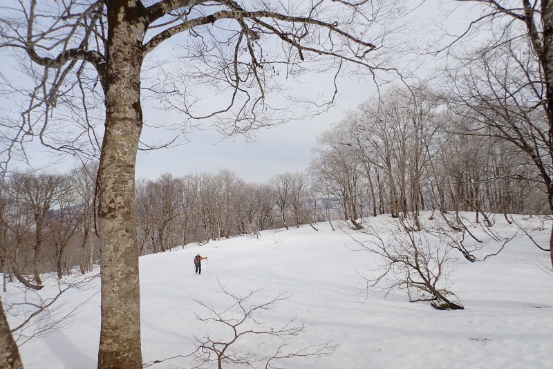 山頂を過ぎると徐々に太いブナが現れ始める。1098m標高点のあたりに広がる雪原はまったく素晴らしい。