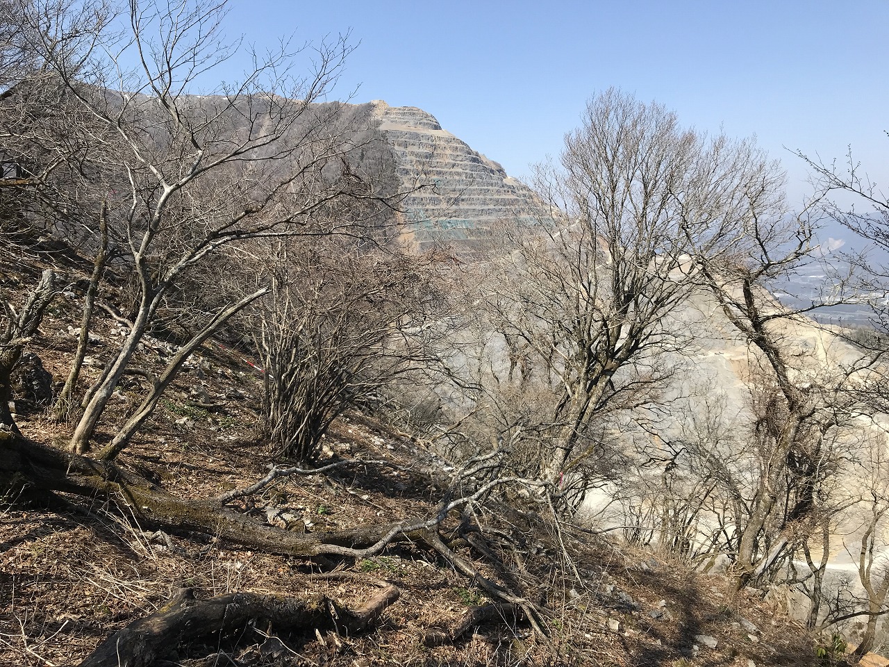 急登で滑りやすい斜面も、花を撮影したりセメント工場や四日市の街並みを見ながらだと、