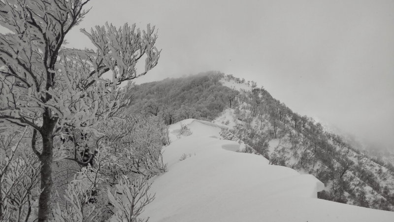 尾根に取り付いた。すると今度は、てんこ盛りの雪を纏ったユキツバキと倒木に行く手を阻まれ、