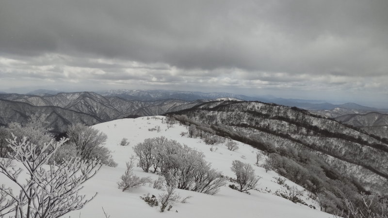 空はどんよりとしているけれど視界は効く。三国岳も見事な白灰色の霧氷を纏っていた。