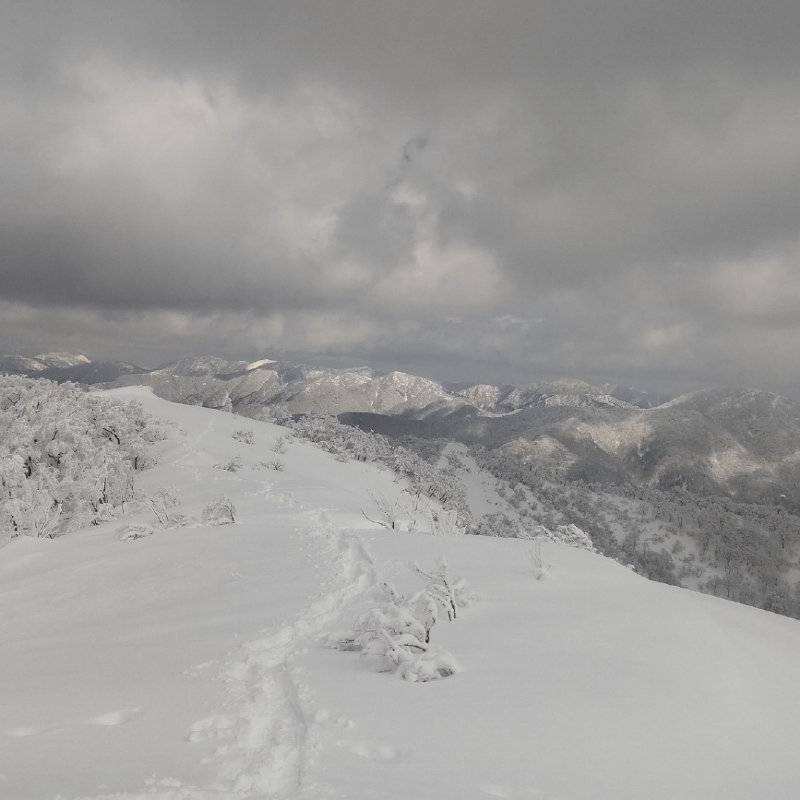 うつくしく波打つ雪庇を渡り、鋼のような強靭さとうたかたのような儚さを併せ持った霧氷の木立を抜けると、視界がぼんやりとしてきて、全ての境がおぼろげな白い世界に踏み込んでいた。傾斜がなくなり上谷山の山頂に着いたのだと分かる。ついに山頂まで来ちゃいましたね。ひとりでオールラッセル。凄いとしか言いようがないです。