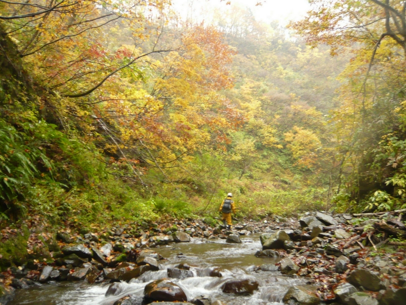 淵もない、滝もない、特に際立った変化もない流れが延々と続く。穏やかな沢という形容のためにある沢と言ったらいいだろうか。あまりの変化のなさに時間感覚もおかしくなり、もう2時間は歩いている、と思って確認した時にはまだ1時間くらいしか歩いていなかった。変化のない流れとは裏腹に左右の山腹を彩る樹林はすばらしい。特に中流域からの紅葉は調度見頃を迎えており見とれて足が進まなくなる。雨の中の紅葉もしっとりとしていいもんだ。とっちゃんは晴れていればなあと言っていたが…