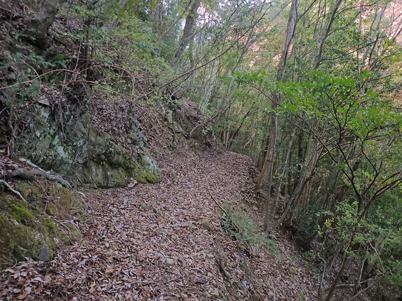 峠を古道はトラバースしながら左の尾根に乗り下ってく。溝道は尾根を九十九折になりながら下っていく。植林地に入ってもうひとつ左の尾根に乗り換え、最後は破線道が県道に合流する地点に着く。