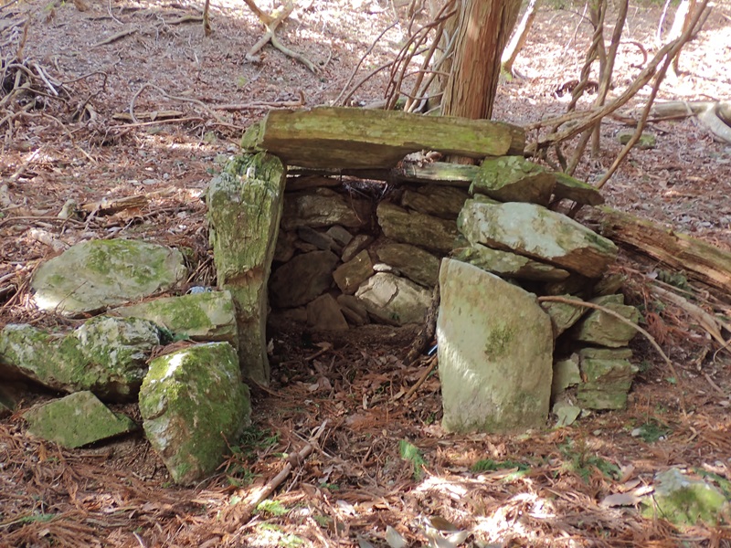 古道の少し上に立派な石垣が見えるので上って行くと、鉄塔が立っている。中電の送電線のような大規模な物でなく、現在は使われていない塔で、何に使われていたのだろう。ここから道は中俣の破線道に向けてトラバースしていく。新緑の沢筋に向けてすばらしい道が続き徐々に沢音が大きくなってくる。沢筋の滝口に着くように道はつけられており石垣道につながった。石積みの道は標高365mの二俣の左俣につけられている。谷が広がった植林のなかに炭焼窯跡があった。道はここから谷筋の少し上をトラバースしながら432mの鞍部を目指していく。ゆるやかな九十九折を使いながら溝道がきれいに残っており難なく峠に着いた。峠には地蔵が祀られた祠がある。地蔵は移されて祠だけが残っている。ここまで赤テープなどはまったく無かったが相津峠の道標が立っていた。長い峠路を登りきった先に光がふりそそぐ峠と地蔵さんが待っている。多くの人達がここで一休みしたことだろう。
