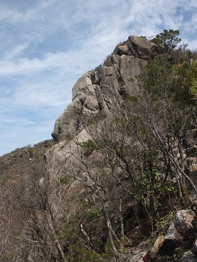 私も入れ替わりに岩に乗りこれから進む南尾根を眺めました。アカヤシオはあまり目に付きませんが、どうでしょうか。